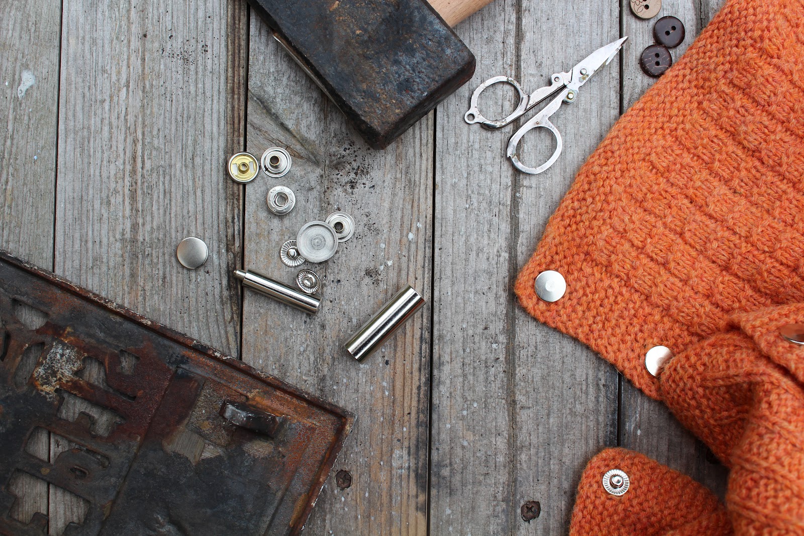 Jeg ble egentlig aldri helt fornøyd med flammejakken. Jakken i seg selv ble fin og oransje nok den, men jeg hadde ikke funnet de riktige knappene og i tillegg hadde jeg tullet så veldig med avstanden mellom knappenehullene at jakken havnet lengst ned i skuffen og ble sjelden brukt. Jeg hadde tenkt meg mørkebrune halvstore treknapper slik som på "originalen," men min knappeforhandler kunne fortelle at det går mote også i knapper så de fine brune og nå også umoderne knappene jeg hadde lagt min elsk på var ikke lenger i produksjon. Det ble istedet noen mindre kokosknapper som jeg aldri helt klarte å forsone meg med. I tillegg var avstanden mellom knappene for stor slik at det ble gliper, og avstanden mellom de to øverste knappene var for liten på grunn av en kraftig matematisk feilberegning. De pinglete kokosknappene var i tillegg så små at de glei ut av knappehullene hele tiden. Jeg tenkte at jeg sikkert kom til å venne meg til det, men jeg gjorde jo ikke det. Legg merke til hvordan jeg til og med lurte dere med å bare vise fram jakken sett bakfra! Og på grunn av det der med avstanden mellom knappehullene var det jo ikke bare å bytte knapper heller. Så en dag, flere måneder senere, kom jeg plutselig på det. Trykknapper! Herved anbefalt som en løsning til andre som har tullet med knappehullene. Jeg kjøpte utstyr på Stoff og Stil, og noen kraftige bank senere kunne selveste flammejakken få tilbake plassen sin blant lillebrors velbrukte strikkejakker. (Som for øvrig skal gjennomgås nøyere i et kommende innlegg). Resultatet ble virkelig fint - jeg fikk sydd igjen de gamle knapphullene og kunne bare plassere trykknappene utover og med passe avstand mellom. Hvilken fryd - selv om det bråkte veldig å få banket dem på plass, selv om jeg ikke fant hammeren og måtte ta til takke med en øks og selv om jeg ikke kom helt uskadd fra prosessen - alt ble bra til slutt.